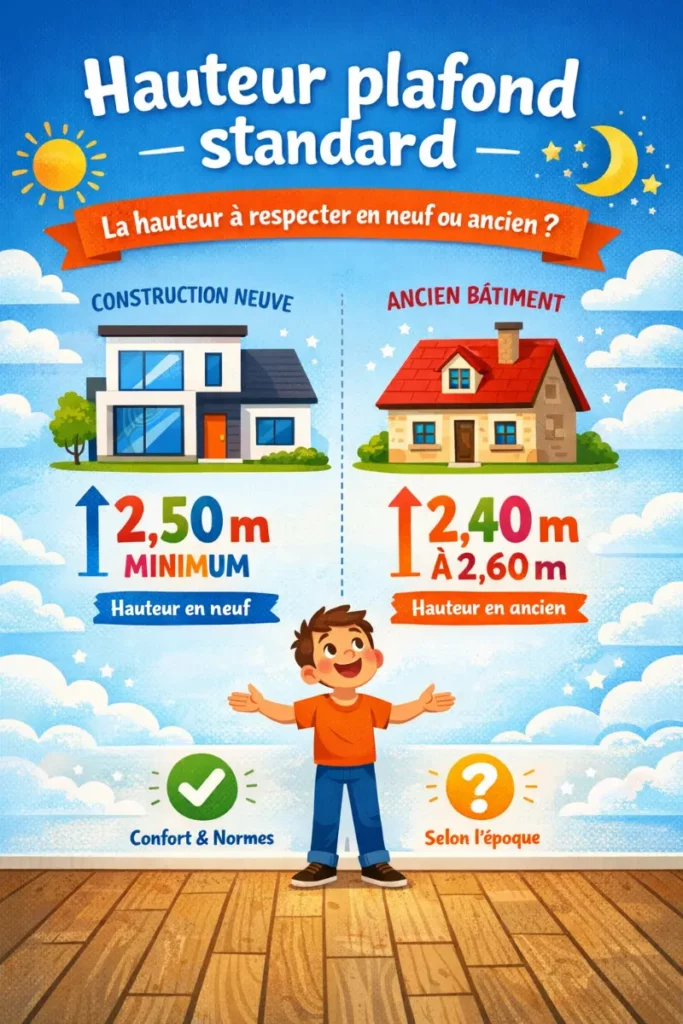 Le standard en construction neuve retient souvent 2,50 m comme référence pratique. La hauteur varie ensuite selon la pièce et l’époque de construction influant sur la surface et la perception.