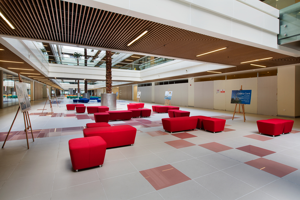 Chantier réalisé en Bi-Planar, résille aluminium linéaire, finition ton bois. Les panneaux 1200x600mm sont clipsés à l’aide de ressort, facilitant l’accès au plénum.