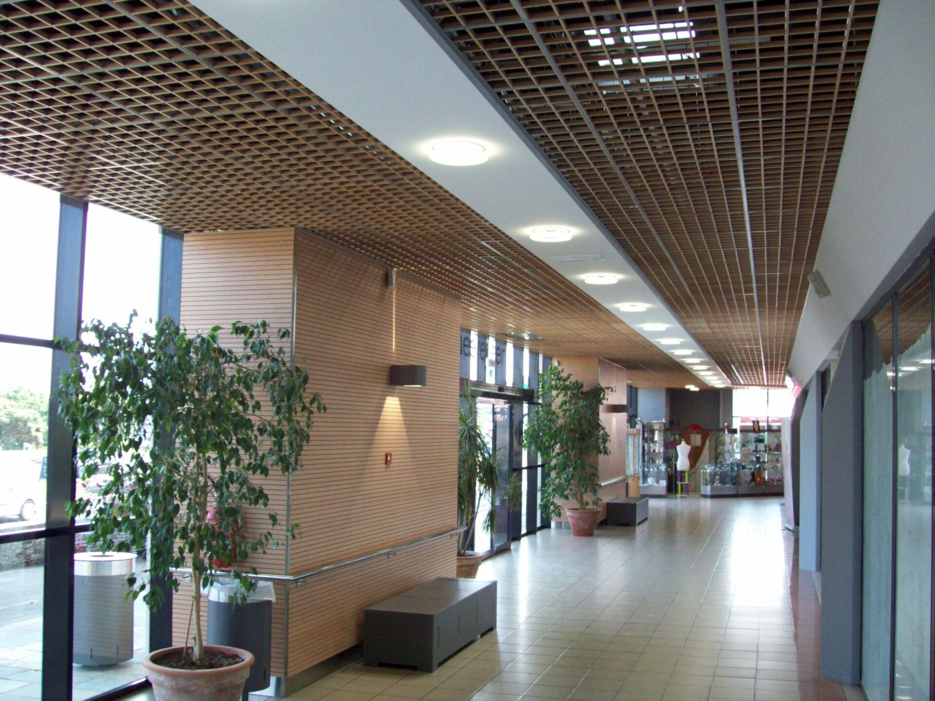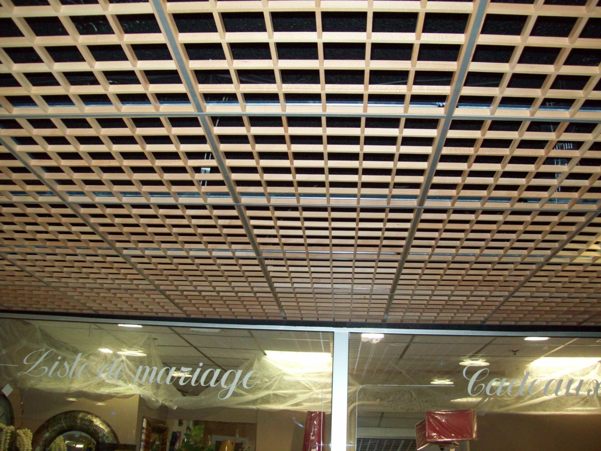 La mise en œuvre du Shiluvit T15, sur ce chantier, permet un accès simple au plenum : l’installation des panneaux 600x600mm (maille 50x50x18mm en Hêtre étuvé) sur une ossature T de 15mm traditionnel assure une démontabilité aisée.