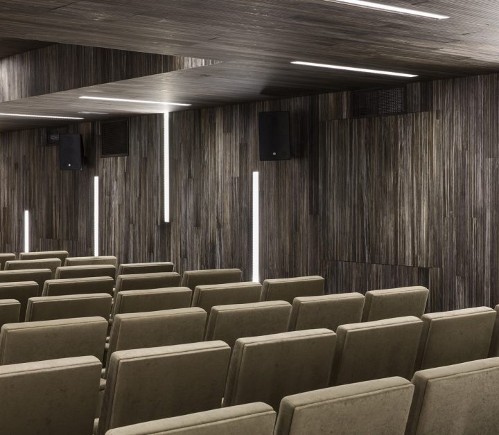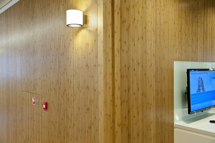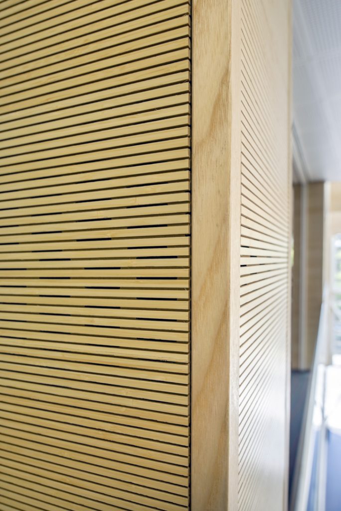 Les panneaux Topline, réalisés sur un support MDF, revêtu d’un placage essence fine, de par son usinage spécifique allie esthétique et acoustique.