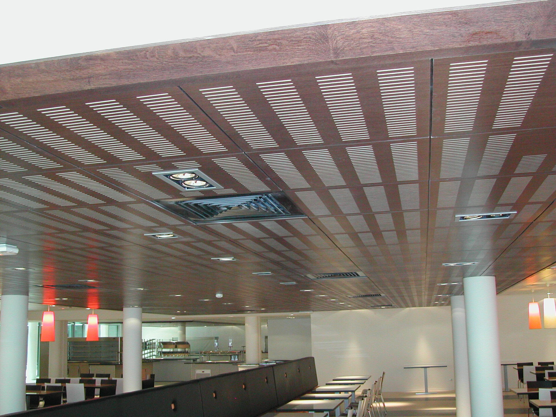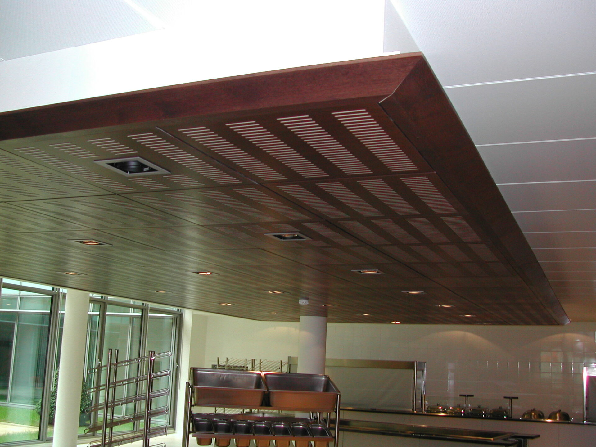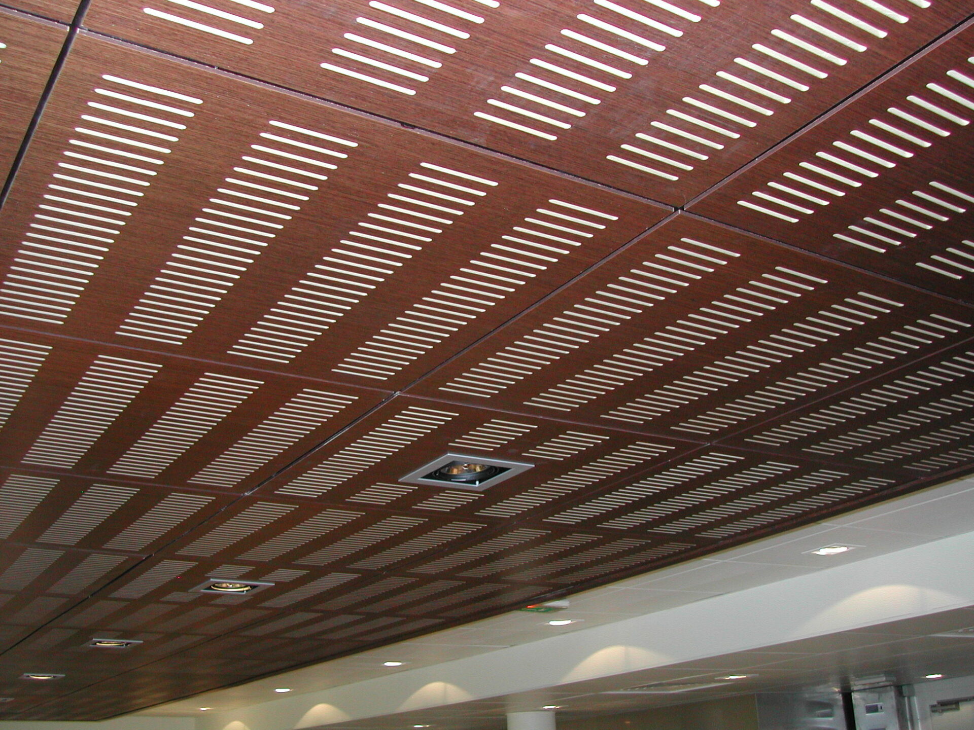 Afin de liés la décoration et l’acoustique, l’architecte a choisi le Lawapan System finition Wengué. La perforation oblongue offre une absorption Alfa w de 0.85. Les profil de rives on aussi été réalisé par Lambri afin de créer les ilots