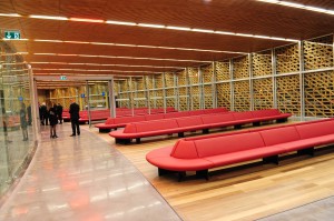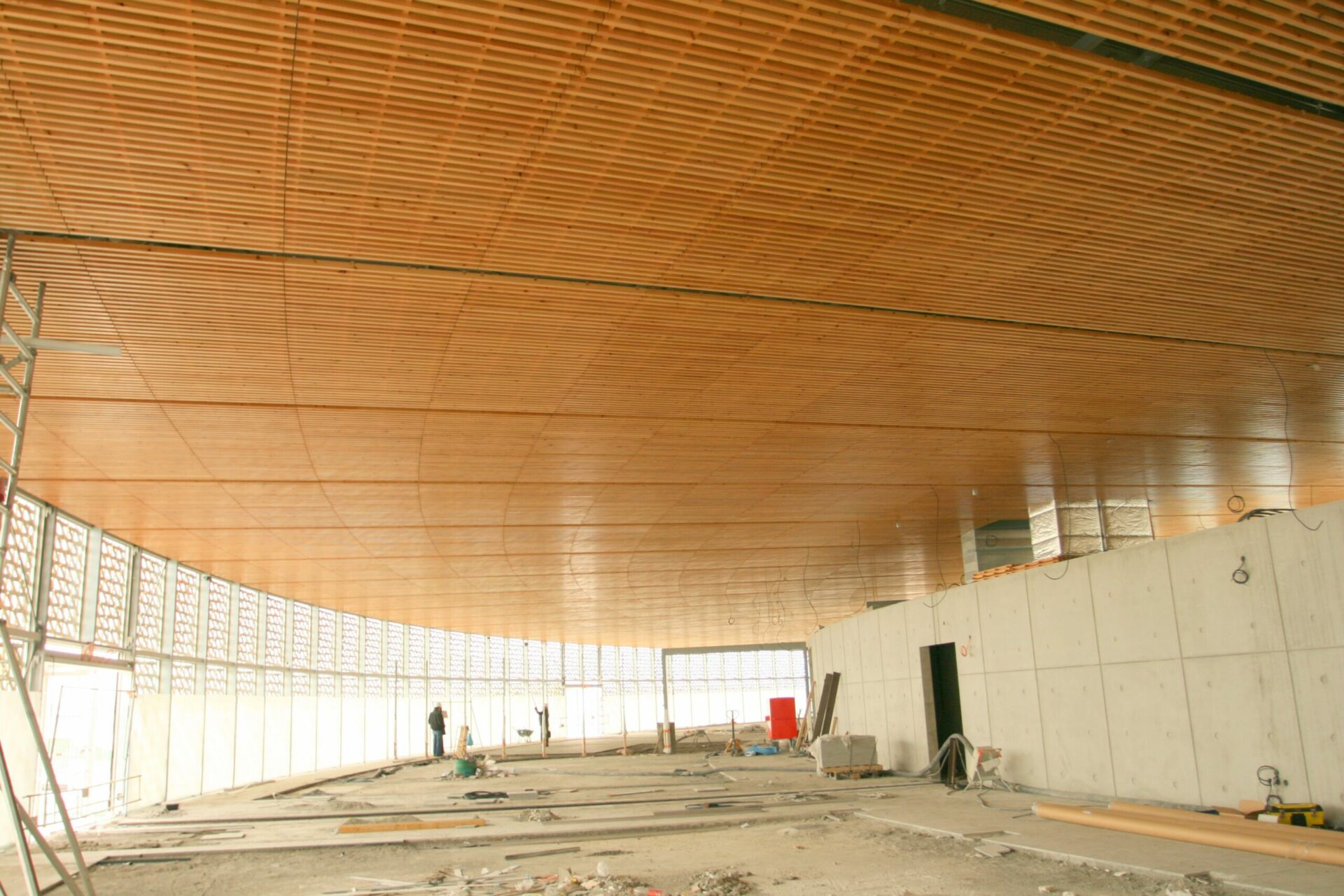 Dans le cadre de ce chantier circulaire, les panneaux de Shiluvit Line (Pin massif) sont trapézoïdaux afin de suivre la courbe du bâtiment. Ce chantier réalisé sur mesure montre la flexibilité de l’usine (Oranit)
